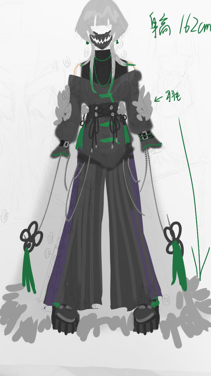 服装简介 本服装以新中式为主要风格,以黑白绿为主色调,以鸩这一中国古代毒鸟为主题添加了许多中式元素以及现代风格,一黑色和幽绿衬托其剧毒和诱惑,以舒张的版型衬托其魅力和气质。(图纸还不够完善,因为时间紧后期会补上更具体的设计图纸)