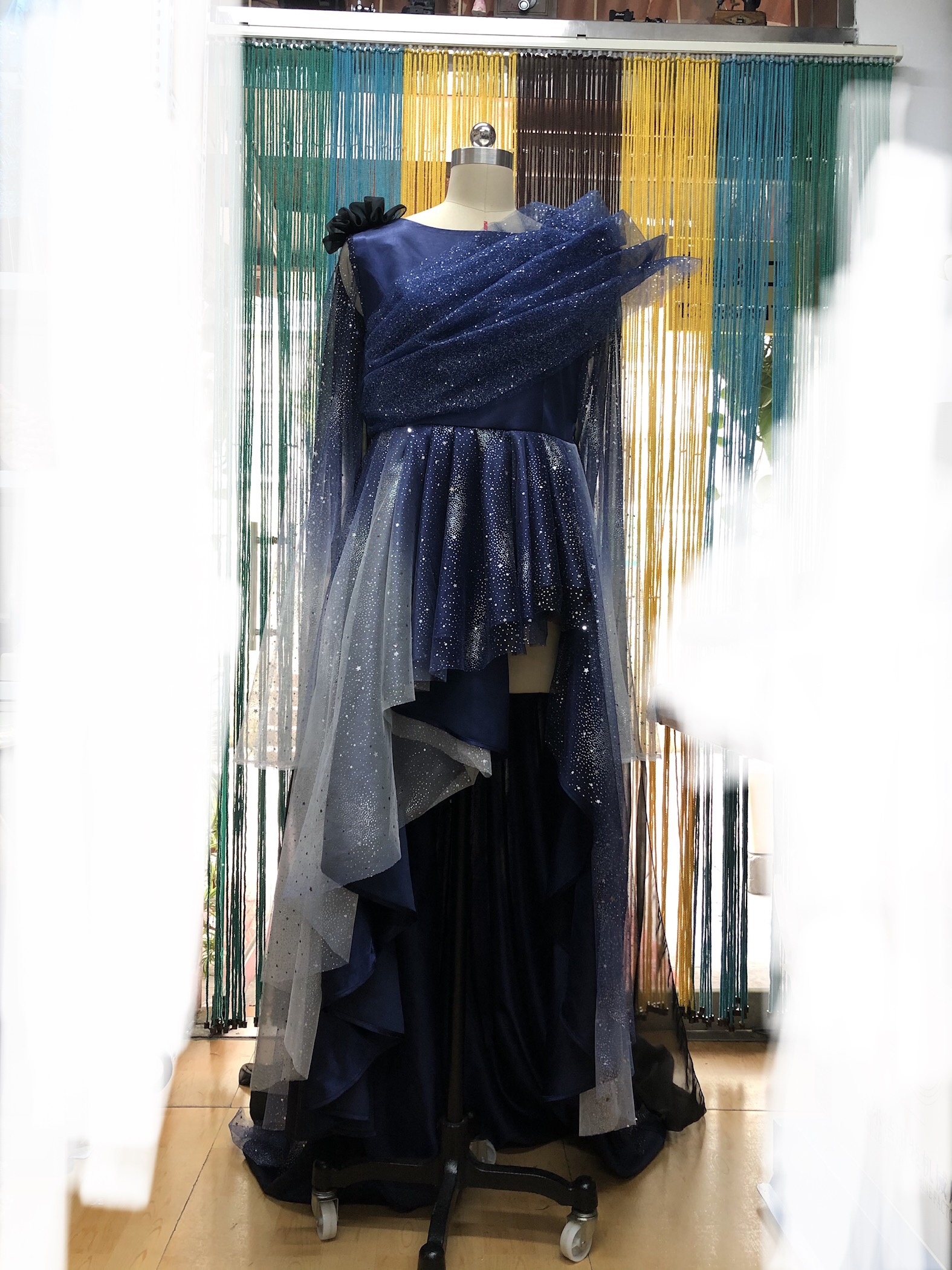 | 服装简介 | 本设计灵感来源于太行山夜间的星空,通过结合所见所闻,运用现代简约风和立体裁剪工艺旨在表达出大自然对人类展现的宇宙的浩瀚无垠,设计中的披纱采用黑色薄纱面料,体现出飘逸之感,其余部位均为藏蓝色,采用亮片网纱,体现出璀璨的星空。 |