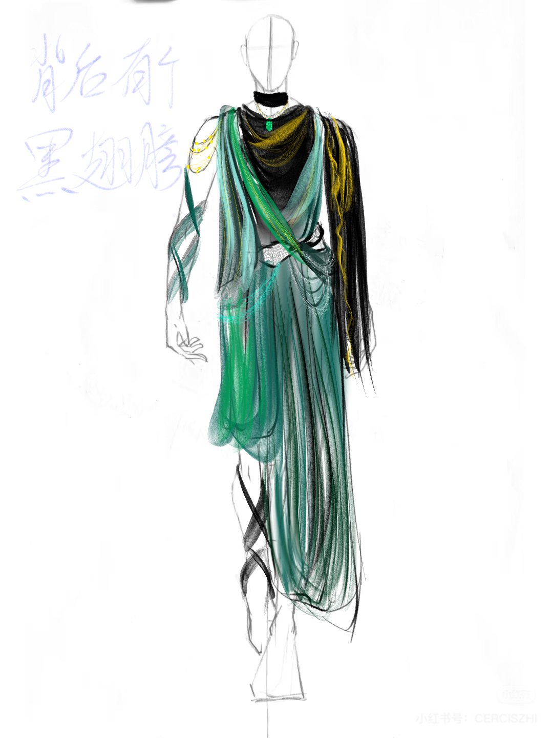| 服装简介 | 设计以深邃黑色为基底,象征智慧的沉静,搭配蓝绿色与水绿色丝绸褶皱,如爱琴海波光般流动。鎏银与金色金属装饰勾勒出奥林匹斯神殿的华美线条,肩部点缀碎闪宝石与银色金属羽翼,隐喻天使翅膀守护知识的圣洁。翠绿与灰绿色腰饰层叠如橄榄枝缠绕,呼应学者袍的典雅。整件衣装以不对称垂坠诠释希腊美学,月光白绶带轻搭臂间,宛如古老卷轴垂落。当步履轻移,碎钻与鎏银泛起星辉,恰似智者于星空下咏叹真理的璀璨。 |